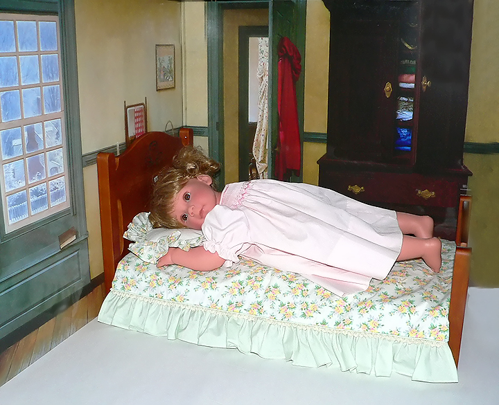 I have taken many photos to show the size with the dolls in the bed. To see the American Girl®, My Twinn®, or 18" Sew Dolling®, LLC size dolls in the bed, please check out the Doll Furniture Boutique by clicking here. We are not affiliated with the American Girl®, My Twinn®, Berenguer®, Madame Alexander® or Lee Middleton® Doll Companies. The bedding is also included and consists of a ruffled pillow with the embroidered words on one side and an off-white color on the other side, a floral coverlet with a ruffled light green skirt on both sides, and of course, there is also a thick mattress to fit the bed. Measurements are: (Outside) 25+7/8" Long x 14" Wide (Inside) 24" Long x 12+1/2" Wide (Height of Headboard) 12+3/4" Tall (Height of Footboard) 9+1/4" Tall |