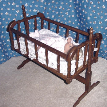 ADORABLE Real-to-Life Swinging Baby Doll Cradle So Cute! Will fit any doll 19" or shorter ! Not for Infants, JUST FOR DOLLS !Bedding IS also Included (Bedding consists of white eyelet mattress and pillow) Measurements are: 20" Long, 12 1/2" Wide, 19" Tall |