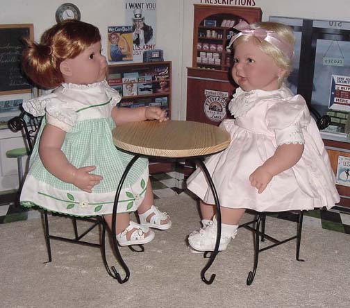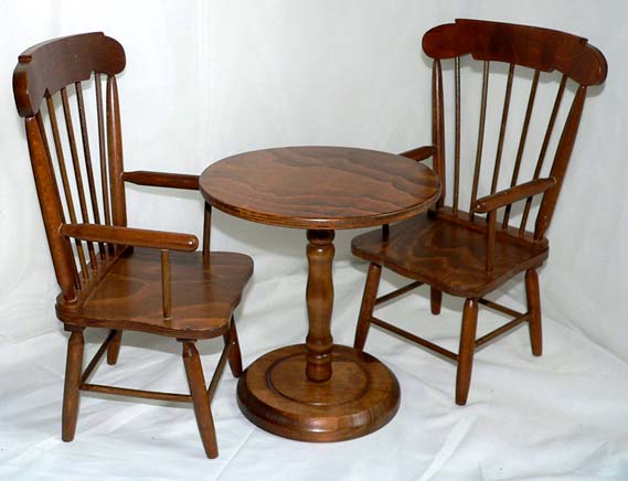 This Doll Table & Chair Set is wonderful for the 20" Lee Middleton dolls! It is a round wooden Romanian table set with 2 chairs that is perfect for a dolly tea time and more! All it needs is the imaginative mind of a child for tons of pretend play! This Doll Table & Chair Set is walnut stained solid wood. It is quite a sturdy set that is perfect for dolly tea time, lunch time or just for a chat! This could be used as a Kitchen set or a Dining room Set. Now all it needs is the imaginative mind of a child for tons of pretend play! Dolls and pretend food items not included.