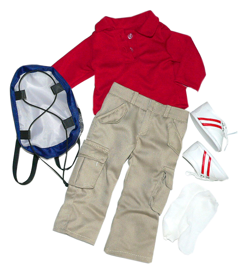 Boy's Red Polo Outfit This outfit has a Long Sleeve Red Polo Shirt, Tan Cargo Pants with working pockets, Underwear, Socks (hard to see in photo), Red and White Striped Sneakers, and a really cool Bunjee Backpack. Yes, it does include shoes and socks :) |