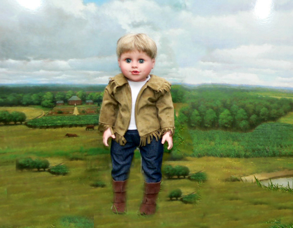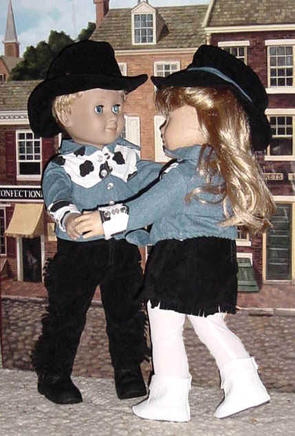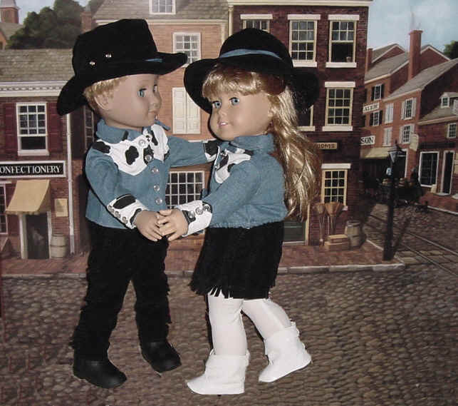 Wild Frontier Outfit What cool outfit to play in the wild frontier! This 4 piece outfit includes the new popular tan faux suede jacket with fringe on the collar, cuff, and hem. Under the jacket, there is a sleeveless white shirt that Velcro's all the way up the back. Jeans accompany the outfit with 2 real front pockets and elastic at the waist. He is ready to go outside with 2 brown double fringed faux suede that zippers up the back to make it easier to put on. Our Rowdie Boy is not included. He is just modeling it, although he wants it. |
