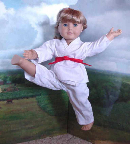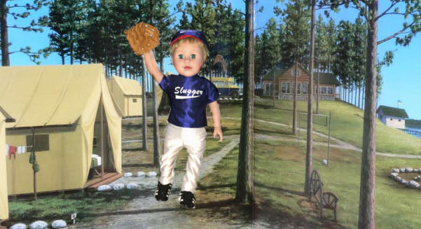 This is a great outfit for the Rowdie Boys™ or a thinner doll like Magic Attic size 18 inch doll, It will NOT fit the 18" American Girl® Dolls who are a bit bigger around. The outfit includes a pair of white pants with racing stripe down the side, a cute Slugger Baseball Shirt that Velcro's in the back and a matching Slugger Baseball hat. I'm not that fond of the belt but you can use it or not. Another great feature to this outfit is that we are adding a real-looking baseball glove. We can't forget a pair of cool soccer shoes and socks. This makes a great gift for anyone with an 18 inch boy doll. The shirt and Hat are now in Blue ONLY |