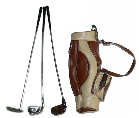 Just Golfing Around (This is for the Clubs and Bag - the boy outfit is above) This is a realistic looking set. The faux leather bag can be easily carried by your doll as he or she heads out to play golf. It has a long zipper down one side of the bag and a short zippered pouch on the other side. There are 3 plastic golf clubs to go with the bag, each one is 8 inches long, a great size for your 18 inch doll to carry, swing, and golf. Golf balls not included in the set. The bag will come in either brown or burgundy depending on stock. |
