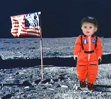 Cutest Astronaut Outfit will fit a boy or girl doll that is 18 inches tall. Outfit includes a Cool orange jumpsuit that has 2 working pockets and zippers and another zipper goes up the front. Each sleeve has a hidden pocket on it. The black stripes on the front have clips for the real effect. Patches on the outfit include a Space Shuttle patch that is just too cute! To top it off there is a black hat with another patch on top. The shoes/boots are now black in color, to go with his hat which is also included. Your boy or girl doll will be ready to be an Astronaut with this adorable outfit. C-591 $22.50 |