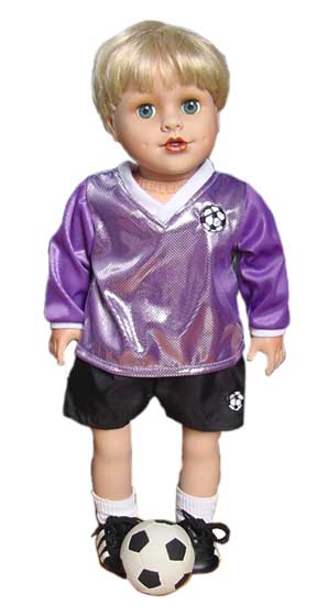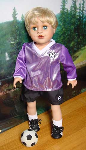 Boy's Varsity Soccer Outfit So cute for this fall! Varsity Soccer Outfit includes a cool purple long sleeve shirt with soccer ball emblem on the front and a v-neck collar, black soccer shorts, and soccer ball. Perfect for any little 18" boy doll. |