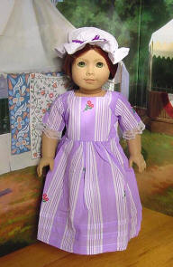This outfit is similar to Felicity's Lavender gown. It has a pretty striped lavender dress with tiny lace embellished on the sleeves. The bottom of the dress has delicate pin-tucks. White mob cap is no longer available.