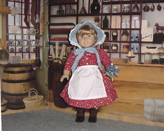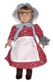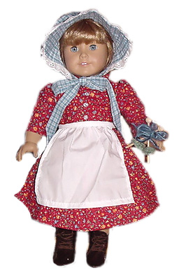 Includes Red Floral Dress, White Apron, Blue Plaid Bonnet that ties in the front, and black metal pail (not shown). *Shoes and Knitting Needles not included* |