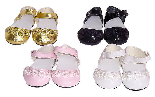 Decorative Mary Jane Shoes So adorable... Dress your doll up in a fancy outfit and add one of these pair of shoes. They have a cute cut-out design in the front and Velcro closed under the buckle. Easy to put on or take off. They also come in White and Dark Red (not pictured) |