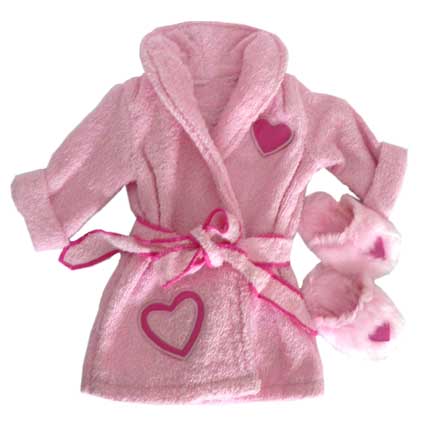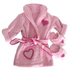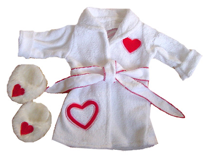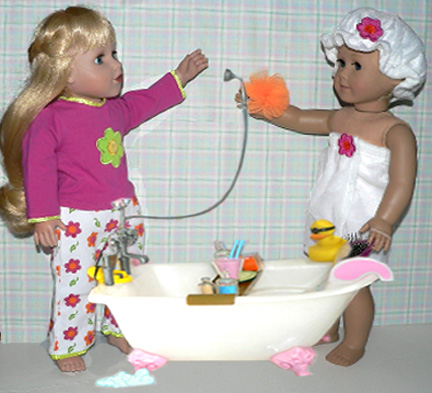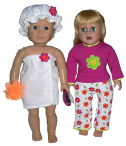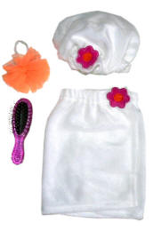 On the left, your doll can enjoy a soft terry cloth wrap which Velcro's in the front. And for her hair to stay up, the set has a matching terry cloth cap with an elastic fit to keep her hair inside. Both have a cute pink flower sewn on. There is a bath poof (scrubby) in orange with a white satin ribbon so she can hold onto it, and a nice hairbrush to finish off the set. |