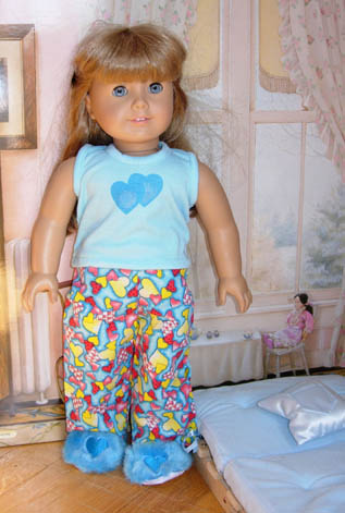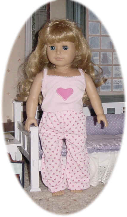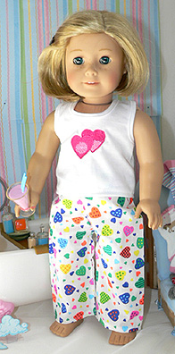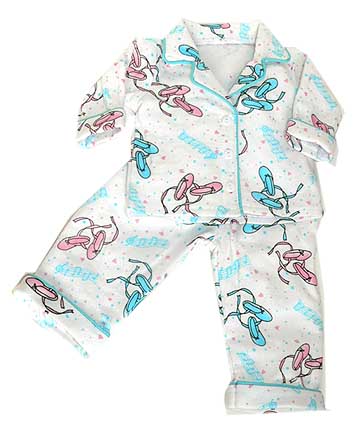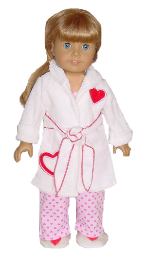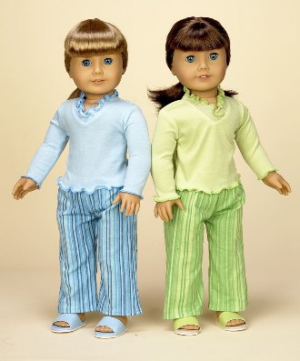 This set is soft flannel with a ballet slipper design. It has an elastic waist and Velcro's up the front. These are perfect pajama's for American Girl dolls! |