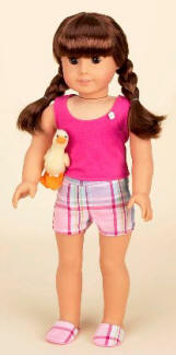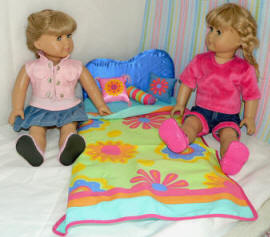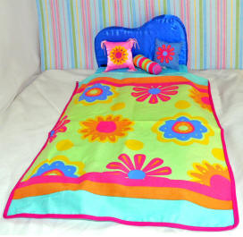 This set is really cool! It will fit the 18" dolls and makes a great summer sleepover set. There is a long light blue mattress that folds to make easy carrying, and the mattress then unfolds to make a 19" mattress and a pretty floral bedspread on top. The bedspread is hot pink, blue, yellow/green, orange, and light blue. The soft head cushion that sits up like a headboard is covered in silky blue fabric. There are three pillows to go along with it, including one with tassles. This is really hot for the new season and is a great item for your doll to bring to sleepovers. It also comes with a clear vinyl case with fabric handle to carry everything in one place.