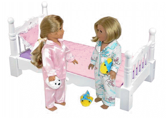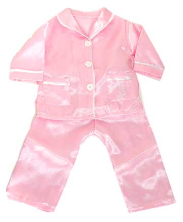 Adorable PJ's for the 18 inch dolls! This one is Pink Satin with pretty white trim and Velcro's up the front with faux white buttons. |