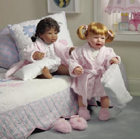 Doll on Right Ready, set…pillow fight! It may be time for bed, but these little girls are dressed for a party…a pajama party that is! Underneath their cozy pink chenille robes are white cotton floral print pajamas with eyelet trim. Each girl even wears a pair of pink fuzzy party slippers. Pillow Included |