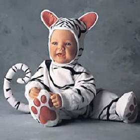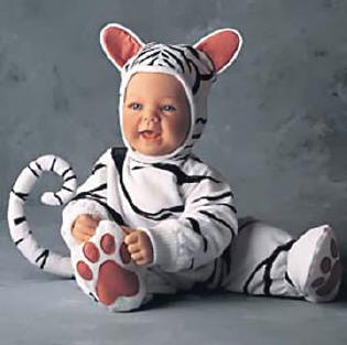Tom Arma's - Please Save The Animals Designed to inspire babies' smiles and capture the spirit of endangered species conservation, this White Tiger doll has an exquisitely molded, hand-painted face with a cheerful expression, realistic blue eyes with long lashes, and straight blond hair. He's dressed in a soft, black-and-white striped tiger outfit complete with a long tail and a soft cap with ears. The doll is part of the limited-production Lee Middleton Artist Studio Collection and comes with a small cloth banana, a doll-size book of Bible verses, and a certificate of authenticity. |